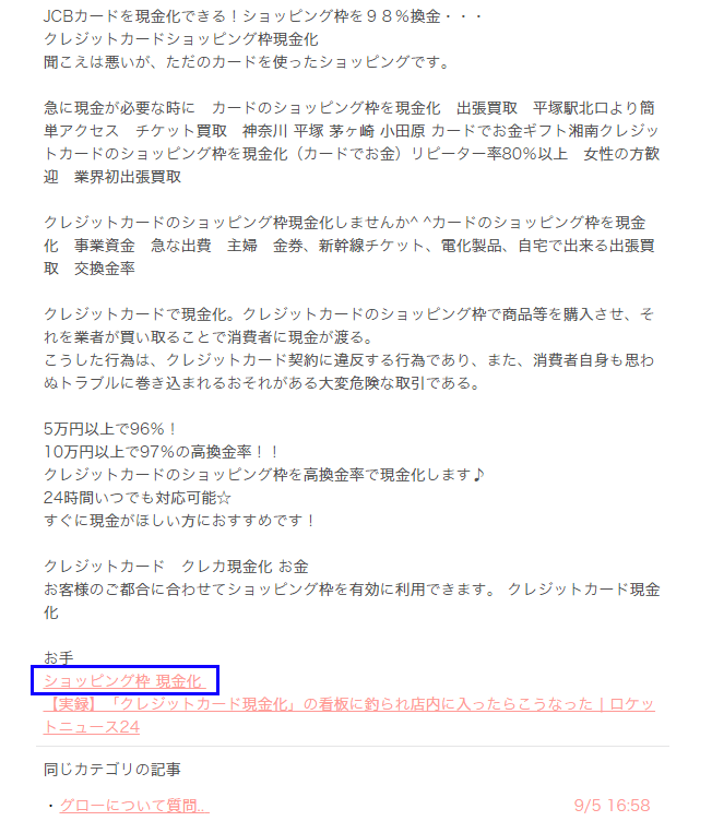 外部施策に使っているのはこんな感じのバックリンクサイトです。記事の下に「ショッピング枠 現金化」というテキストリンクが設置されています。(ページのキャプ)